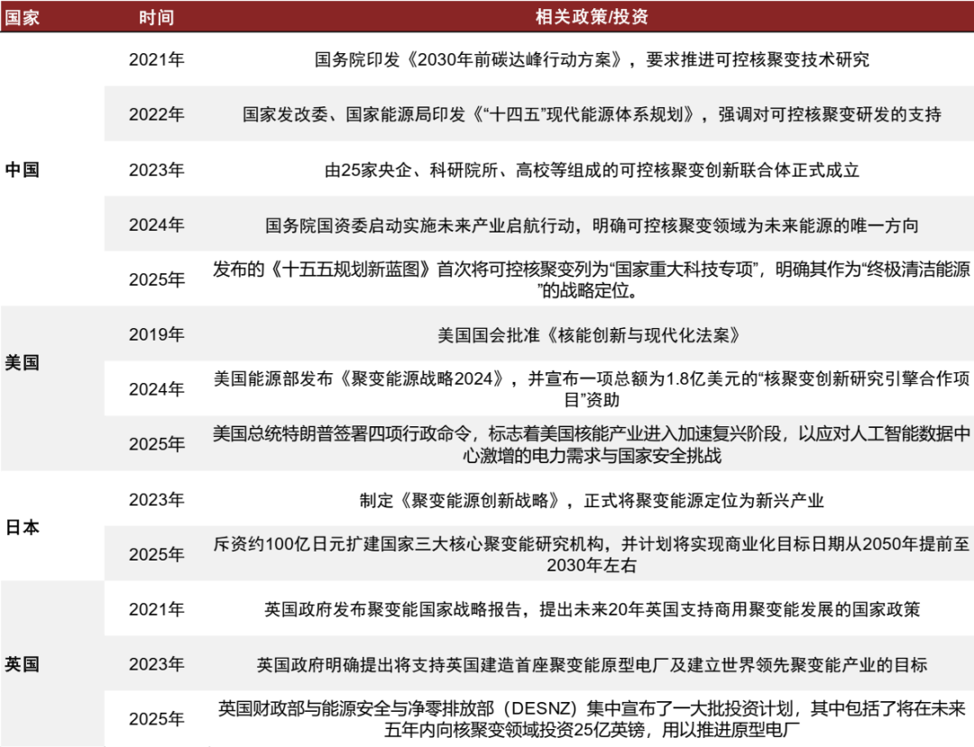 全球主要经济体在政策端和资金端持续加码。作为全球能源格局变革的前沿领域,近年来各国政府密集出台核聚变发展战略,推动跨部门协同,明确核聚变在未来能源结构中的核心定位。中国近期将核聚变纳入“十五五”及未来产业重点方向,美国、日本、英国等国则通过专项立法、资金引导等方式加快落地节奏,形成从顶层设计到产业实践的全链条支持体系。各国政府在政策与资金方面的协同发力,正在显著缩短核聚变商业化进程的时间线,也为全球核聚变产业生态的初步构建奠定基础。
