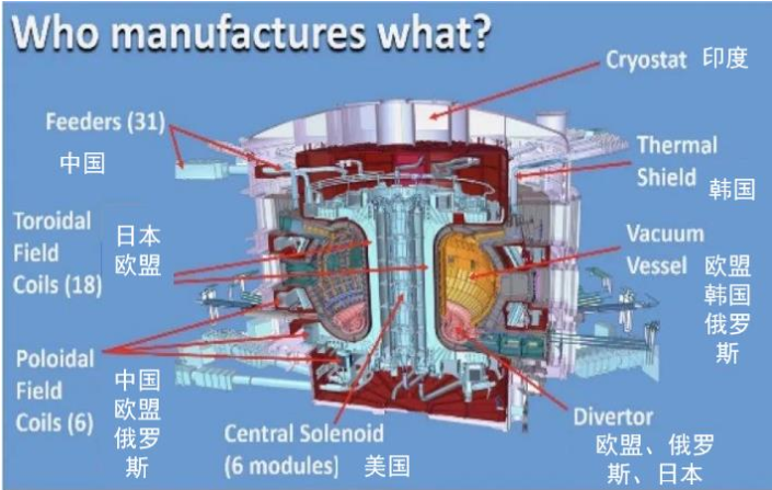 “实物分摊+经费出资”的多国合作模式。欧洲承担建设成本比重最大,约为45.6%;剩余部分由中国、印度、日本、韩国、俄罗斯和美国平均分担。中国承担了包括极向场线圈导体、磁体支撑系统、包层第一壁等关键设备的设计与制造任务,其中核工业西南物理研究院、中科院等离子体物理研究所是中方参与ITER的主要承担单位,国光电气、安泰科技、西部超导等企业也参与到相关部件、材料、工艺的研发和加工当中。2025年9月11日,由中国承担的ITER诊断系统首个关键部件径向X射线相机(RXC)实现成功交付。