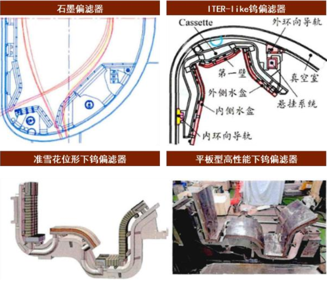偏滤器是磁约束聚变装置中专门用于控制等离子体杂质和排出热粒子的功能组件。偏滤器通常位于真空室底部,是等离子体废物和能量的主要出口,其核心作用是清除等离子体运行中产生的高能氦灰、杂质离子及中性粒子,防止杂质回流污染核心等离子体,同时承担吸收、分散巨大热流的任务,是整个聚变堆中热负荷最集中的部位。考虑到偏滤器面临的瞬时热流密度高达10MW/m²,其表面通常采用钨或钨铜合金等高热导率材料,背部则结合高效冷却结构实现热量迅速转移。[5]