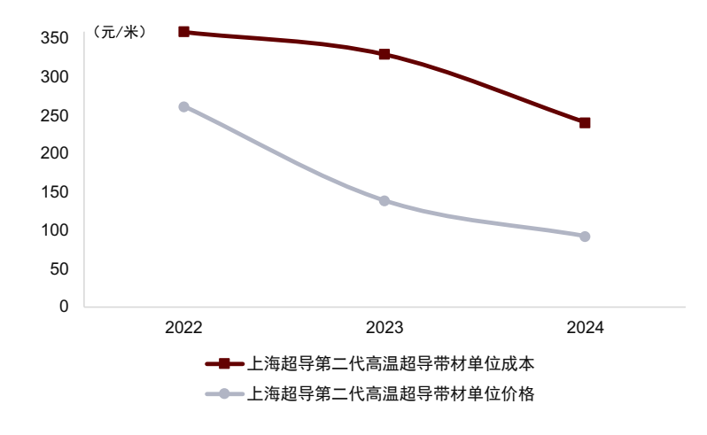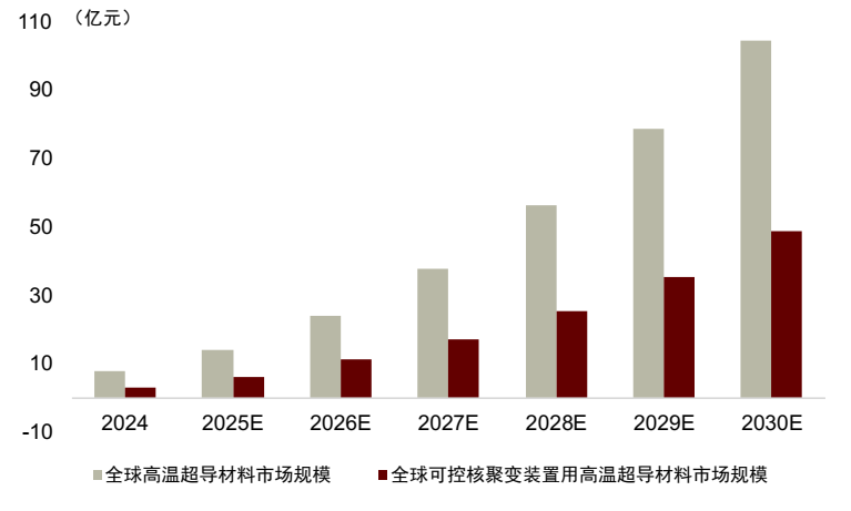 高温超导技术突破+成本下降有望引领核聚变装置走向商业化。第一代BSCCO高温超导材料在磁场下临界电流衰减很快,且原材料成本较高,使得其应用推广范围相对较窄。而第二代REBCO高温超导带材具有高载流能力、高不可逆场、高机械强度和原材料成本低等优势。根据上海超导招股说明书,上海超导第二代高温超导单价/成本已从2022年的360/262元/米降低至2024年的241/93元/米,降幅分别为33%/65%。随着第二代高温超导材料价格下降和良率的提升,有望进一步提升高温超导材料在核聚变装置中的使用。根据赛迪网,全球磁约束可控核聚变用高温超导材料市场规模预计从2024年的3.0亿元达到2030年的49.0亿元,期间CAGR达59.3%,行业规模有望实现快速增长。