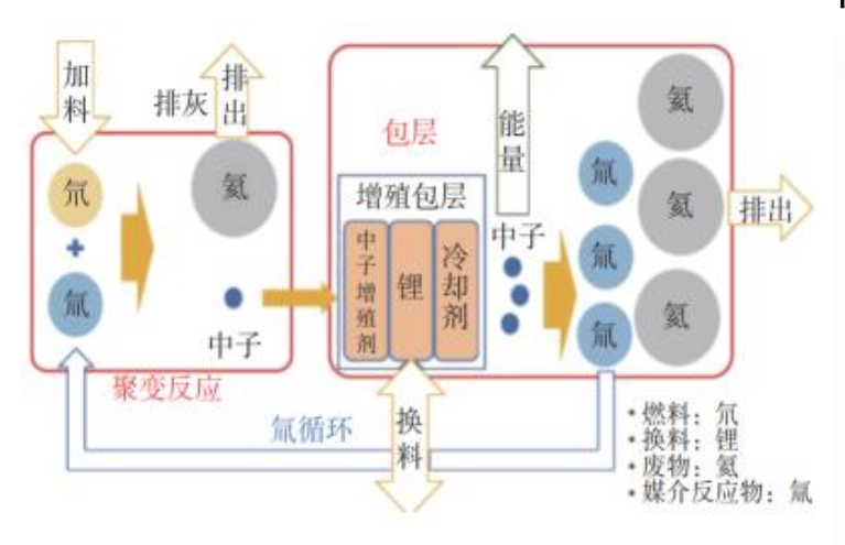 2)资源瓶颈小:氘氚聚变作为能源,氘大量存在于水中,每升水可提取出约0.035克氘,通过聚变反应可释放相当于燃烧300升汽油的能量;氚可通过中子轰击锂来制备,而锂在地壳、盐湖和海水中大量存在;
