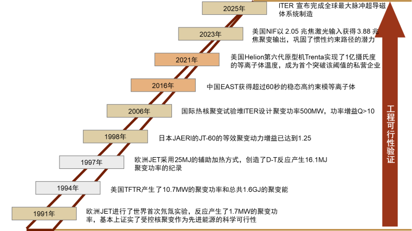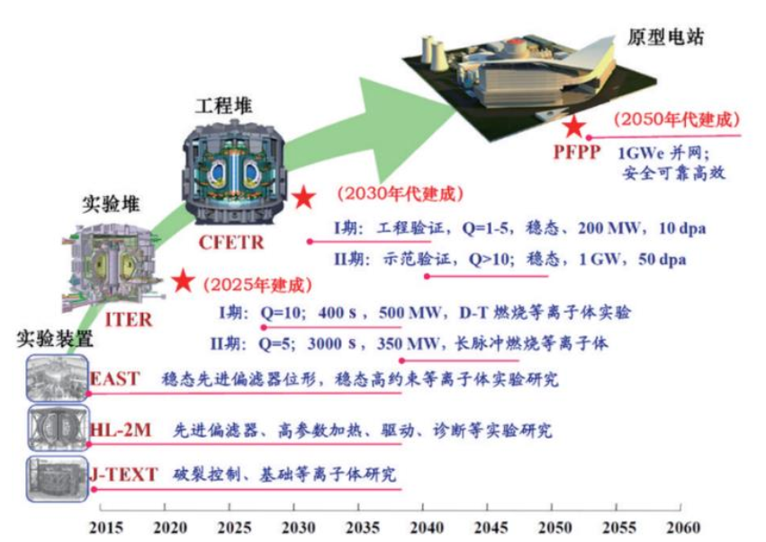 国内构建较为完整的聚变实验体系。根据我国工程科学代表文献,我国核聚变技术路线建议为如下技术路线:1)第一阶段,力争在2025年推动中国聚变工程试验堆立项并开始装置建设;2)第二阶段,到2035年建成中国聚变工程试验堆,调试运行并开展物理实验;3)第三阶段,到2050年开始建设商业聚变示范电站。