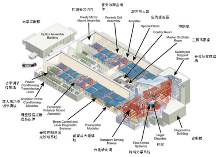 美国国家点火装置NIF是全球代表性的惯性约束聚变研究平台。该项目由美国能源部下属的LLNL实验室主导,NIF采用的是惯性约束聚变路径:通过192束激光在数十亿分之一秒内同步聚焦,释放超过2兆焦耳的能量于毫米级燃料球,实现对氘氚混合物的快速压缩与加热,依靠燃料自身惯性完成聚变。该路径在实现聚变能量释放时间控制、装置尺度紧凑性和快速能量释放等方面具备一定优势。