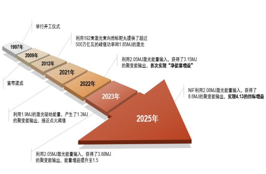 3)能源密度高:2025年4月,美国劳伦斯·利弗莫尔国家实验室(LLNL)的国家点火装置(NIF)创造了纳秒级8.6兆焦耳的能量输出[2];